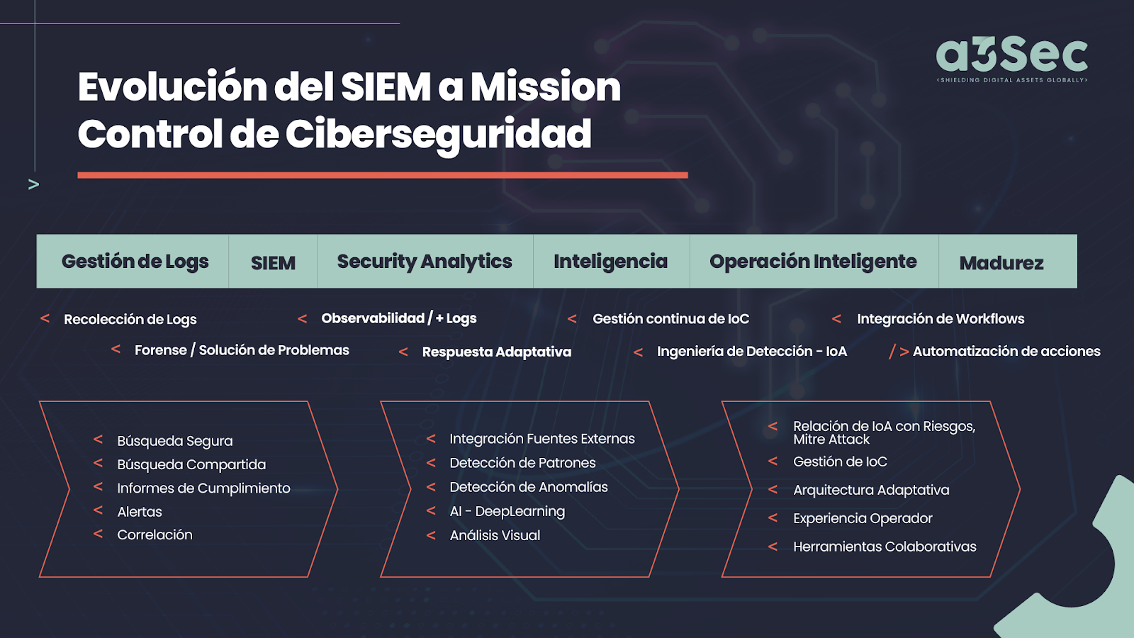 - Correlación de logs, gestión de eventos y alarmas de ciberseguridad.