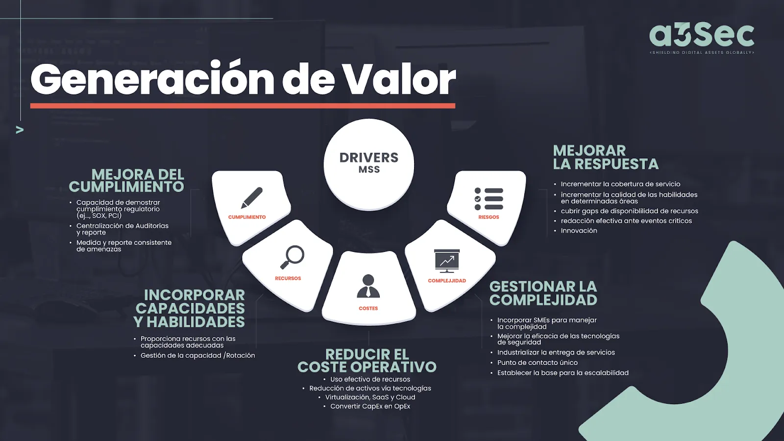 El SIEM es el núcle del servicio y cuenta con personal de primer nivel para analizar los eventos, así como otros equipos para investigación. Sus procesos se enfocan en la gestión de incidentes de ciberseguridad, donde la gestión de tickets y casos logra apoyar dicho proceso.