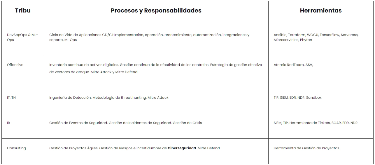 Cada tribu tiene a su cargo procesos y herramientas específicas, con la misión de evolucionar dichos procesos y encontrar nuevas formas de hacerlo de forma más eficiente. A continuación, se presenta la tabla que muestra las tribus, sus procesos y las herramientas requeridas para llevar a cabo sus tareas de manera eficiente: